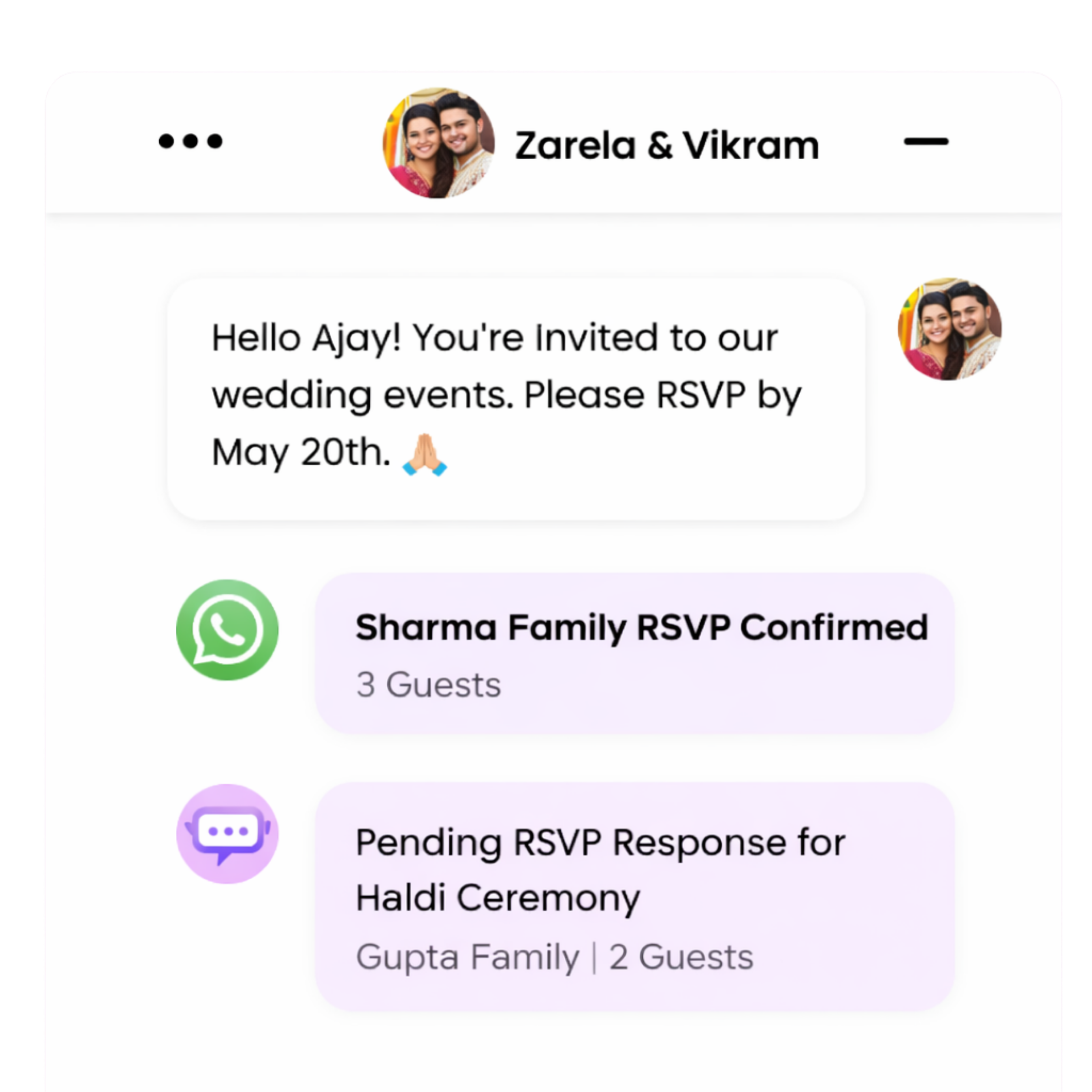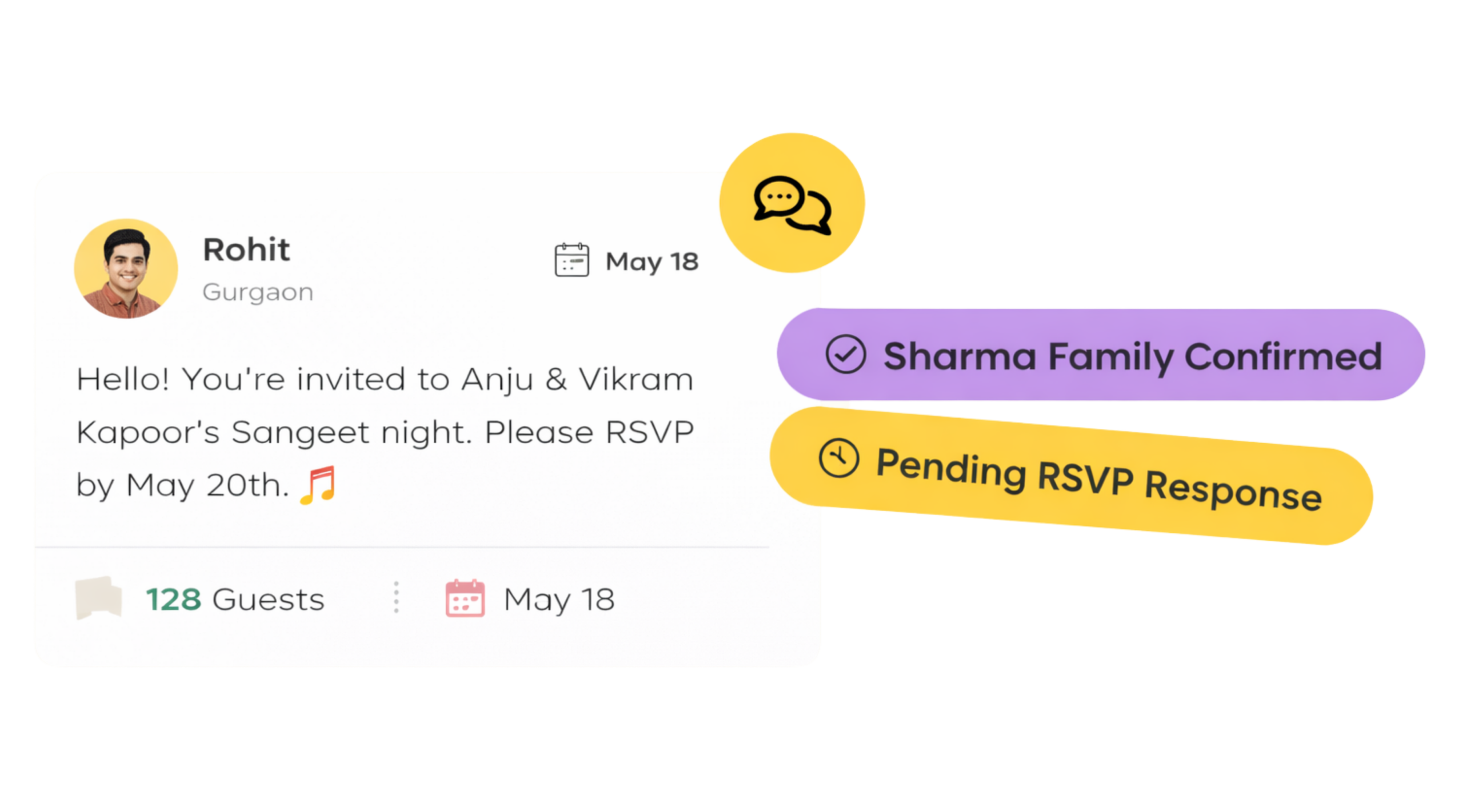 You can see RSVP responses in real time and send automated reminders to pending guests. This eliminates repeated calls and manual tracking through spreadsheets or WhatsApp messages.