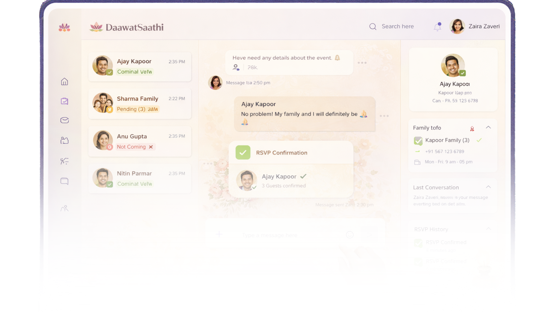 From wedding functions to family gatherings, DaawatSaathi helps you manage guests, responses, and updates effortlessly — all in one simple dashboard.